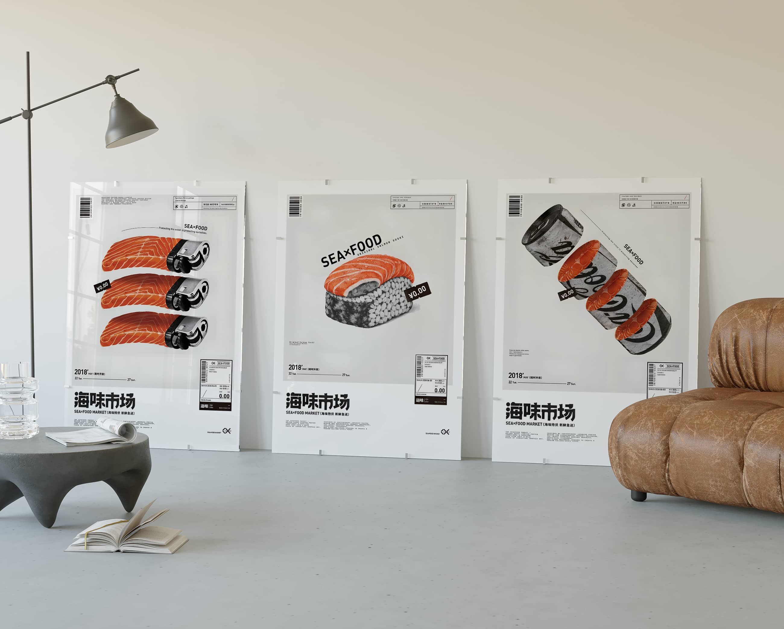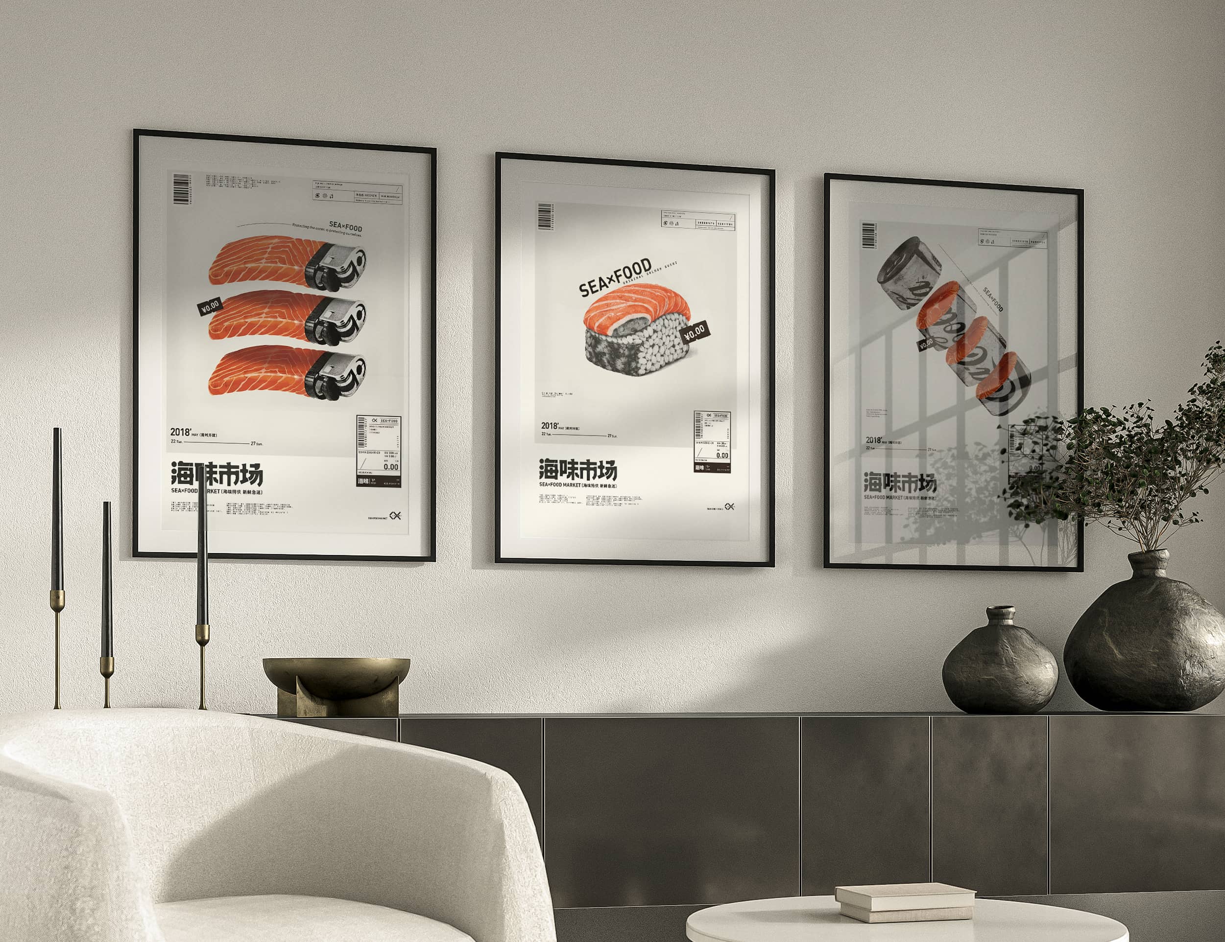 Japanese seafood market poster prints displayed in modern living room