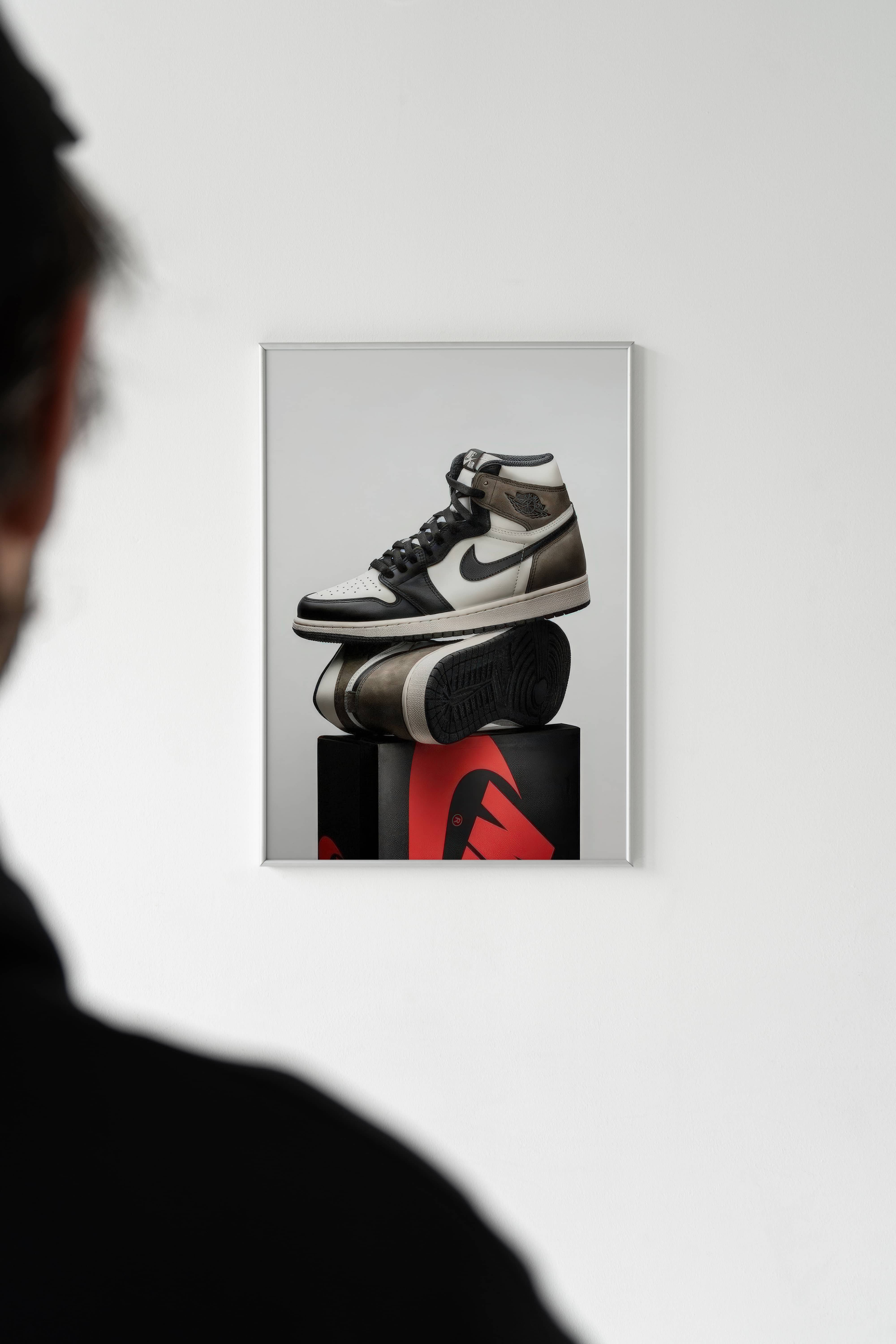 The Air Jordan 1 High Monochrome Poster captures one of the most legendary sneaker silhouettes in a bold, sculptural composition. Featuring a stacked Air Jordan 1 in a refined black-and-white palette, this artwork blends street culture with gallery-style minimalism.