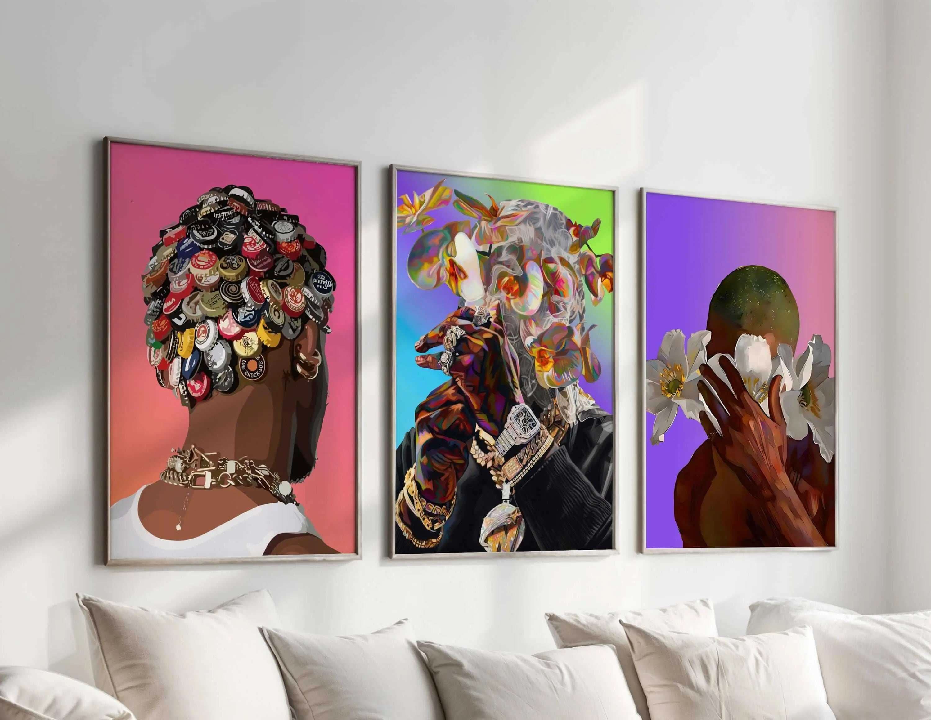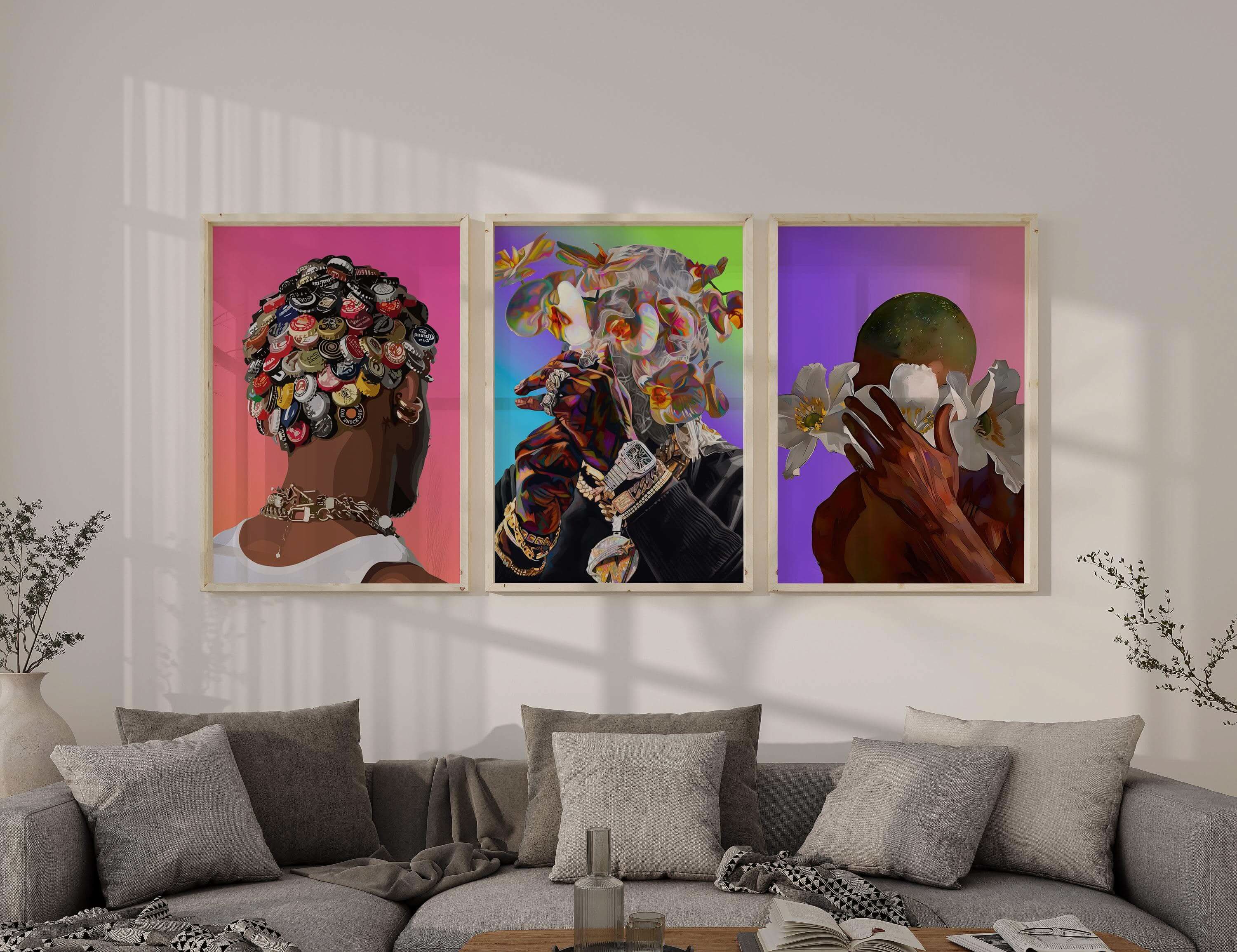 Abstract Flower Black Men Wall Art Set of 3 featuring vibrant designs celebrating cultural beauty.