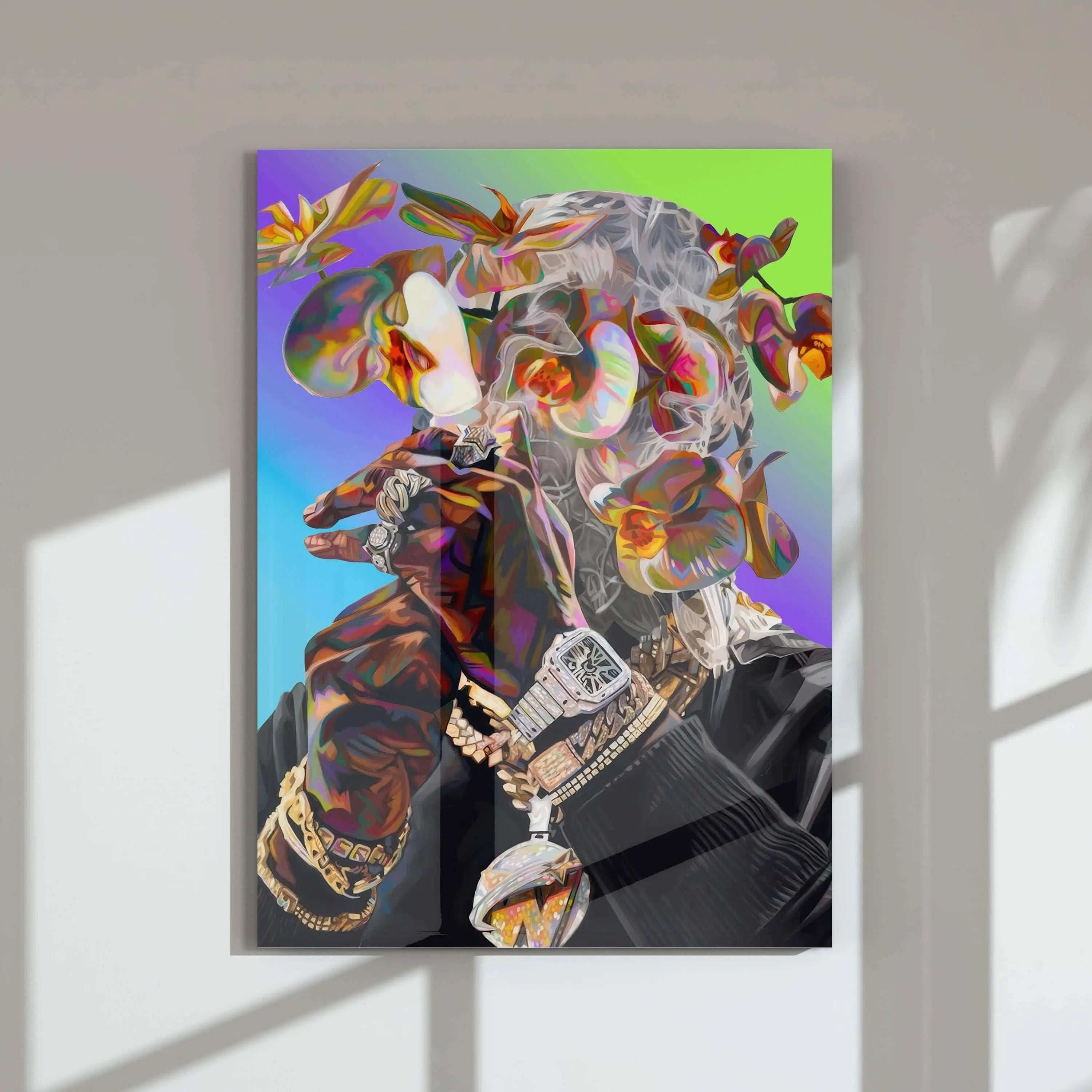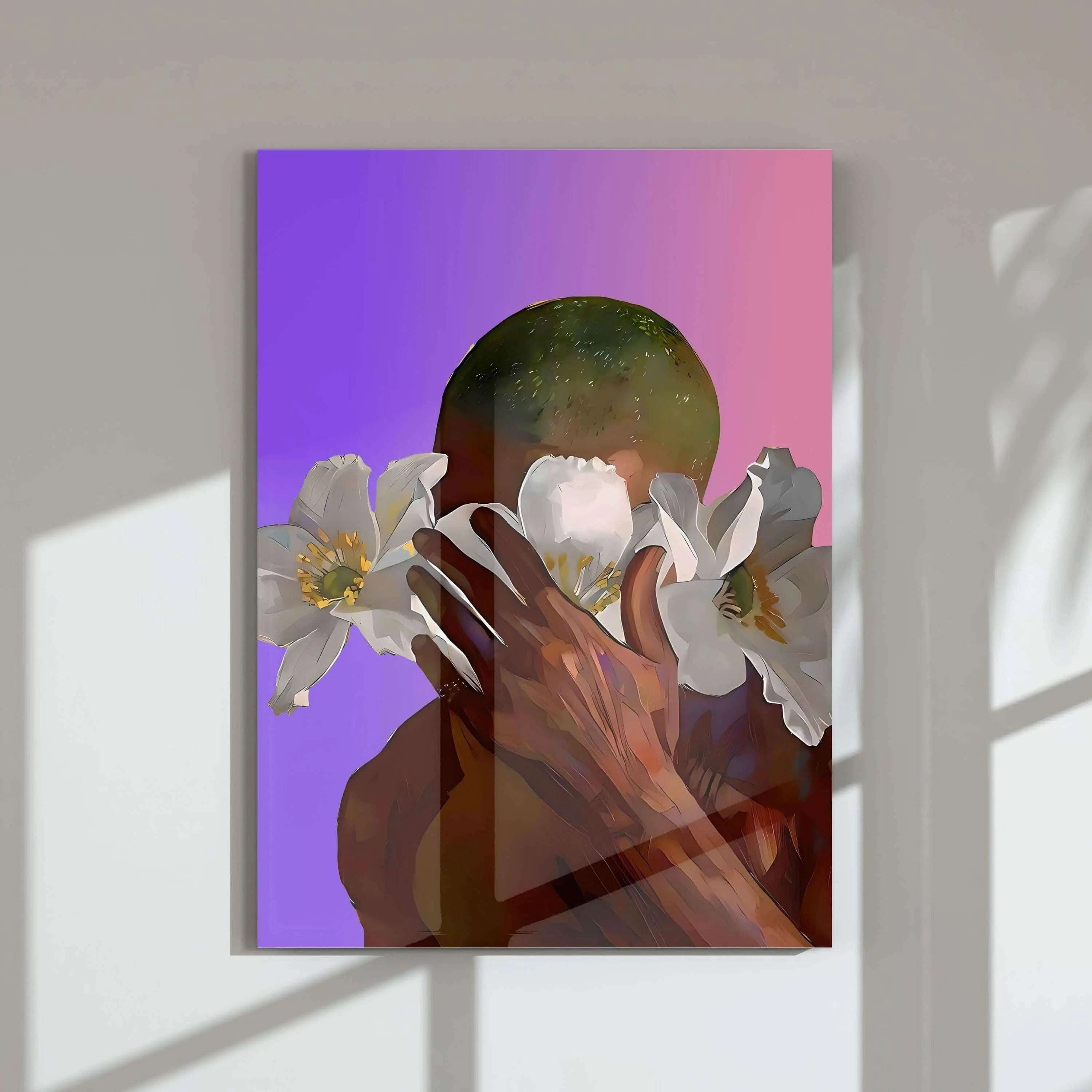 Abstract wall art depicting a figure holding flowers against a bold gradient background.