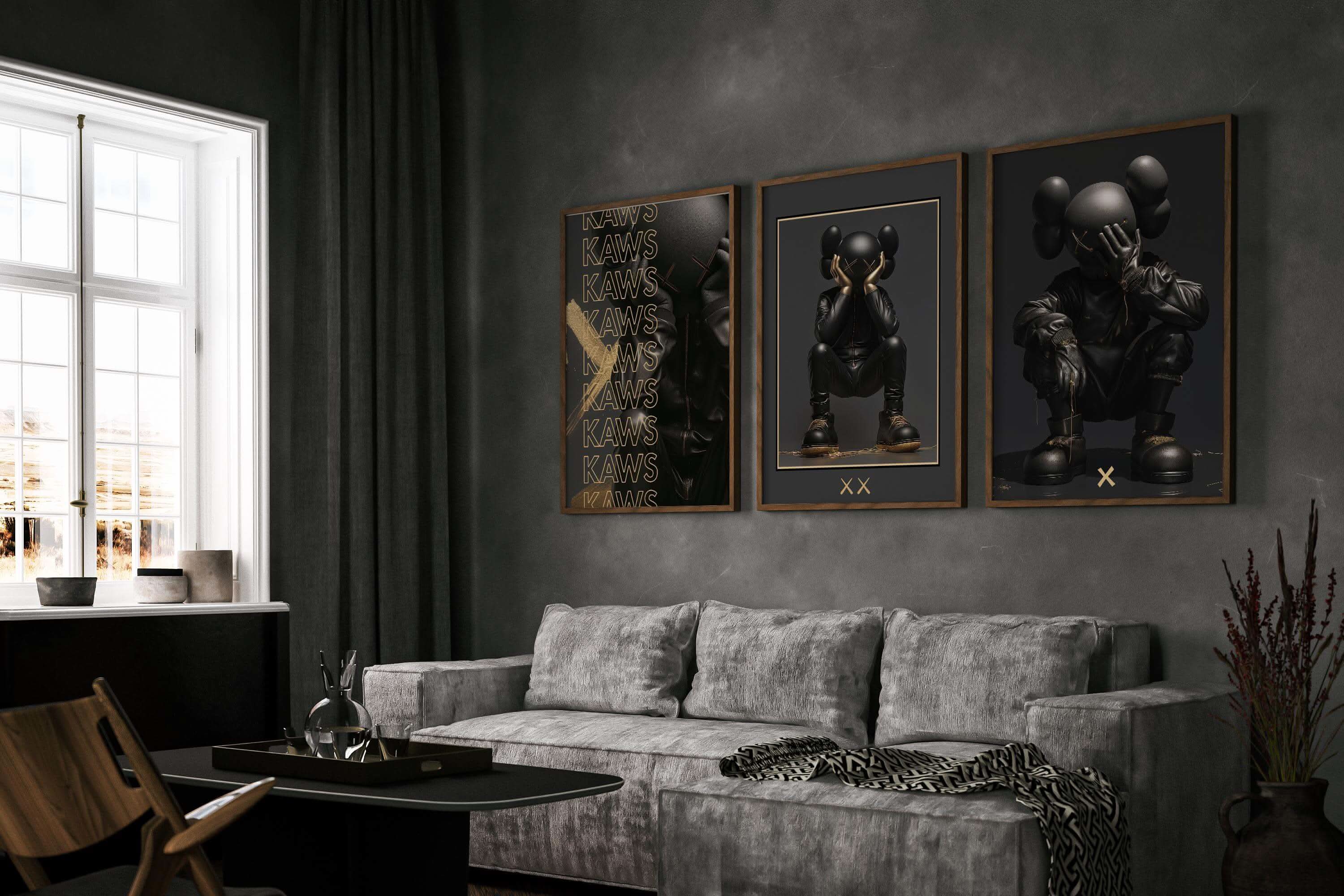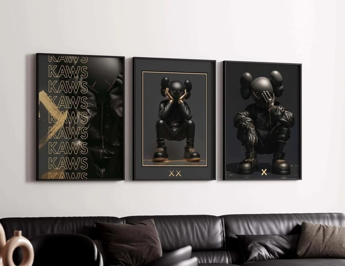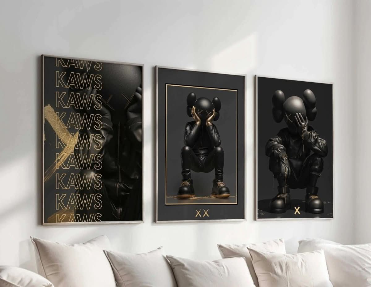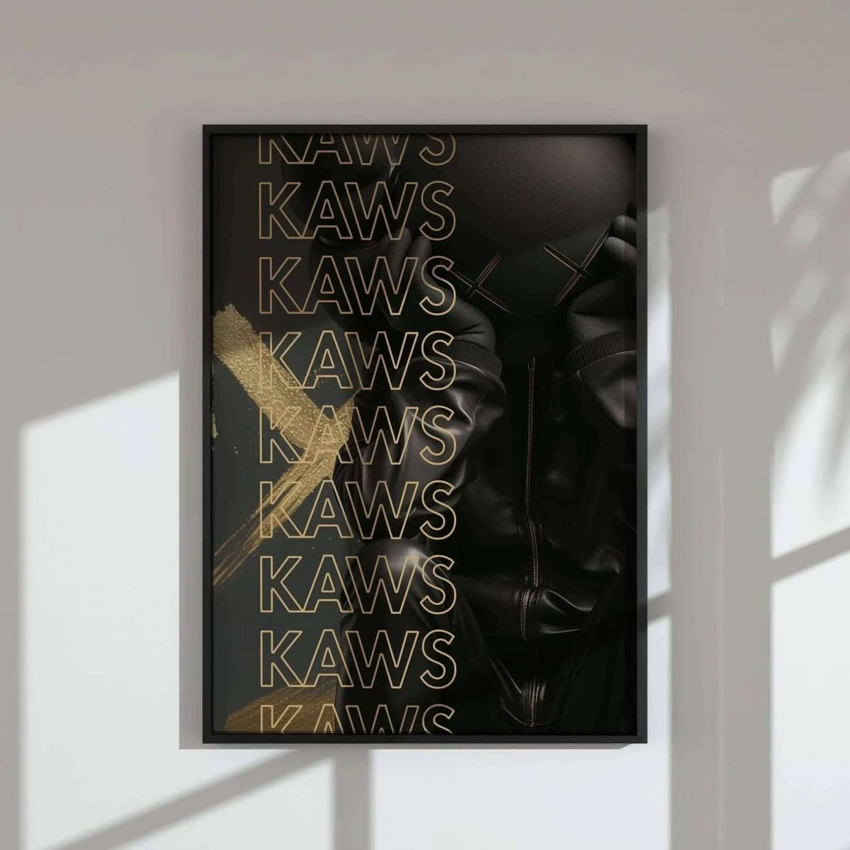 Close-up of the first poster's design, highlighting the repeated "KAWS" text in gold against a dark background.