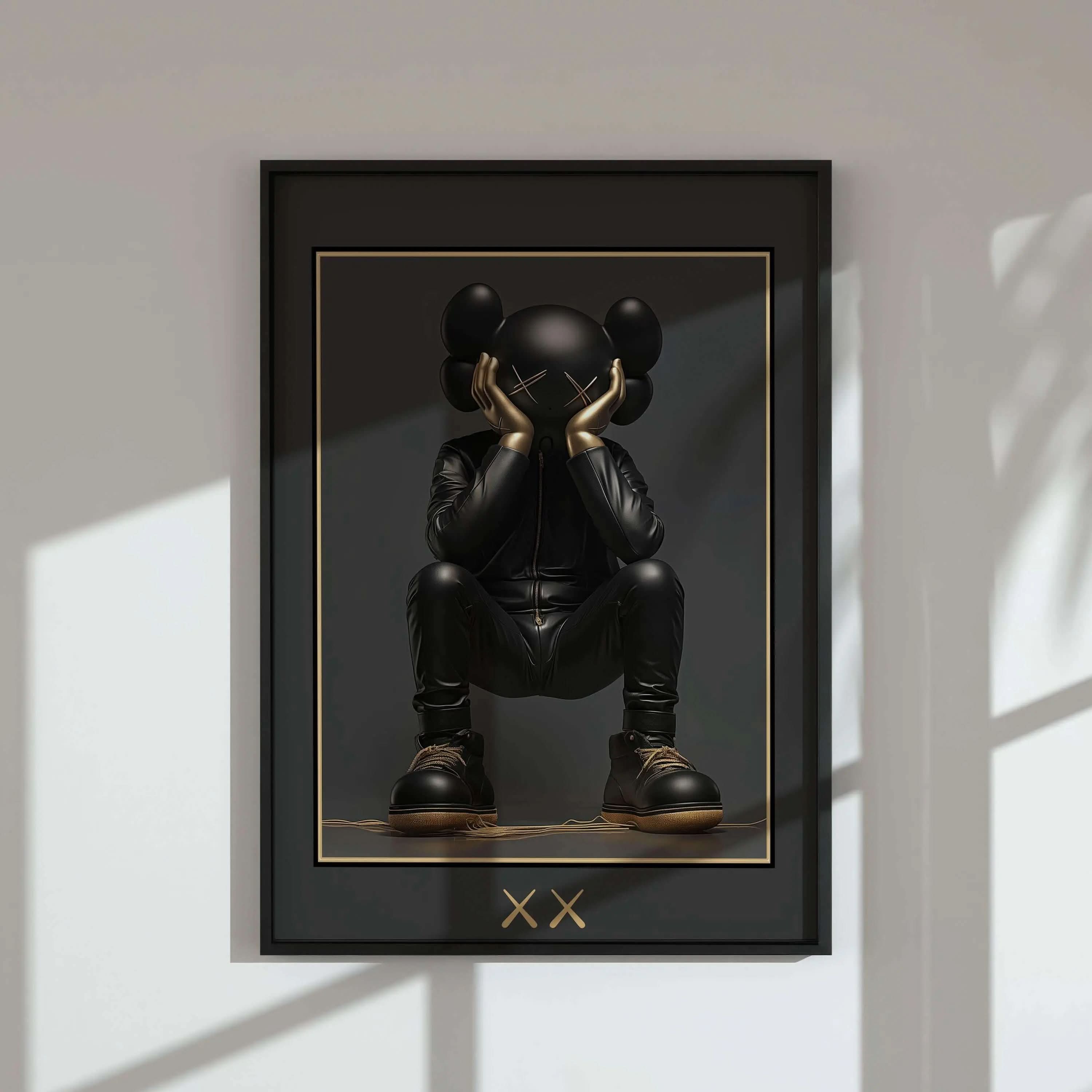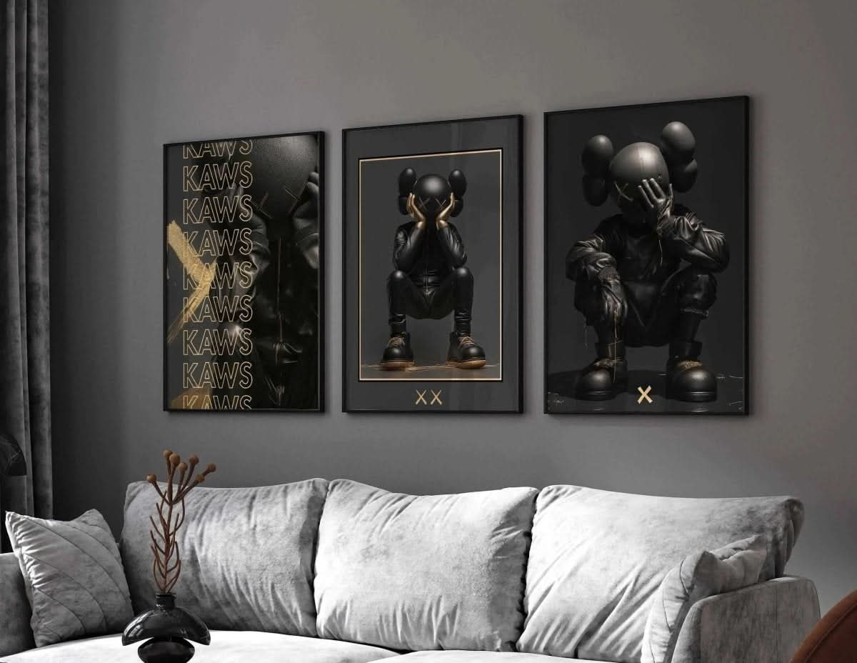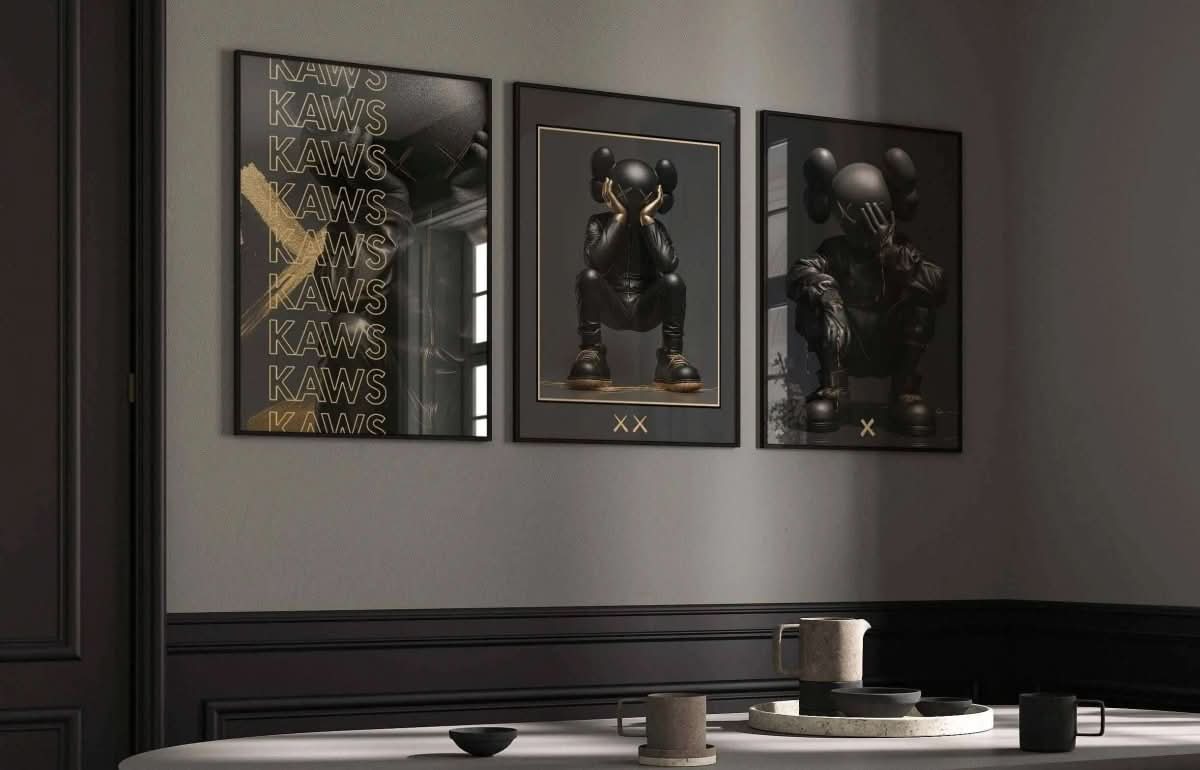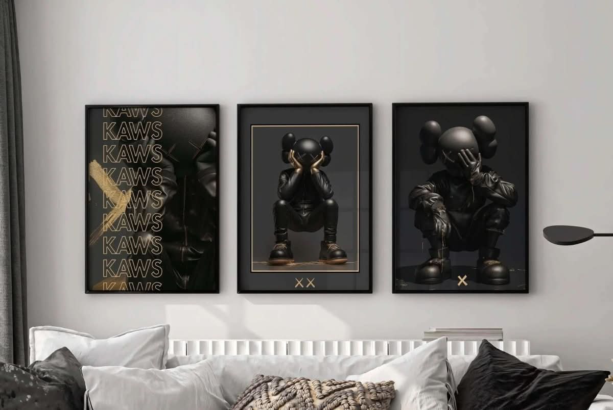 Close-up of the first poster's design, highlighting the repeated "KAWS" text in gold against a dark background.