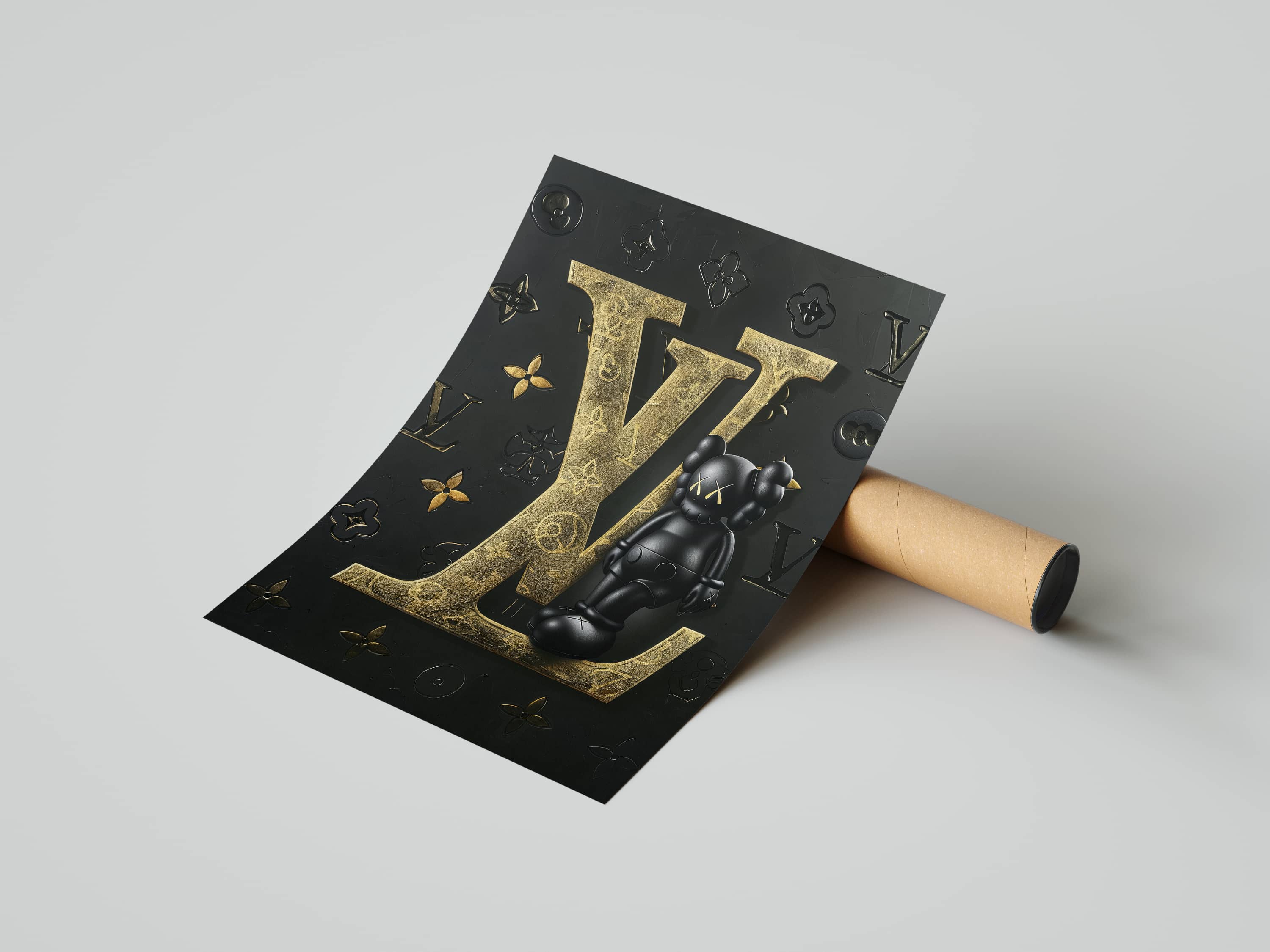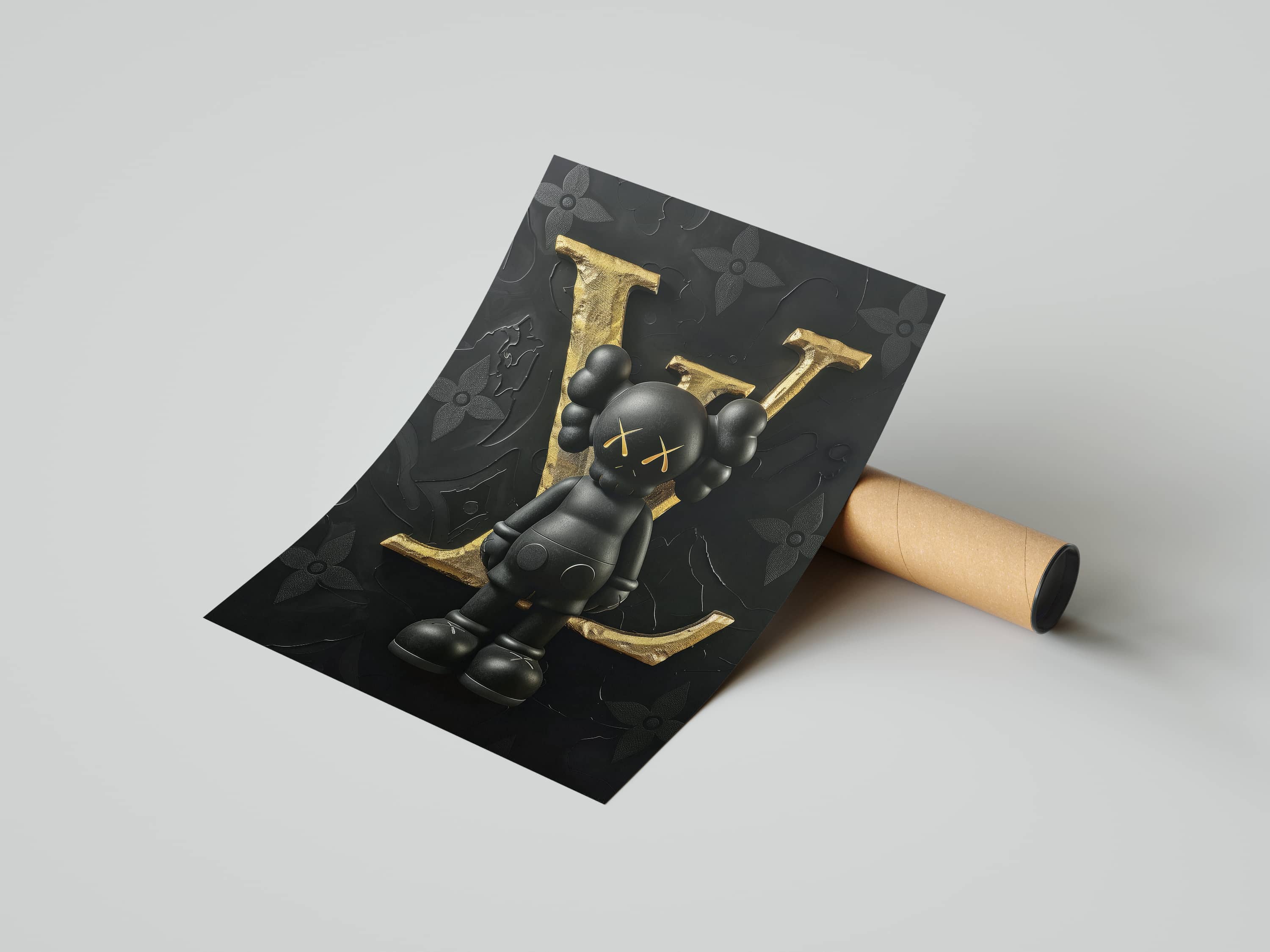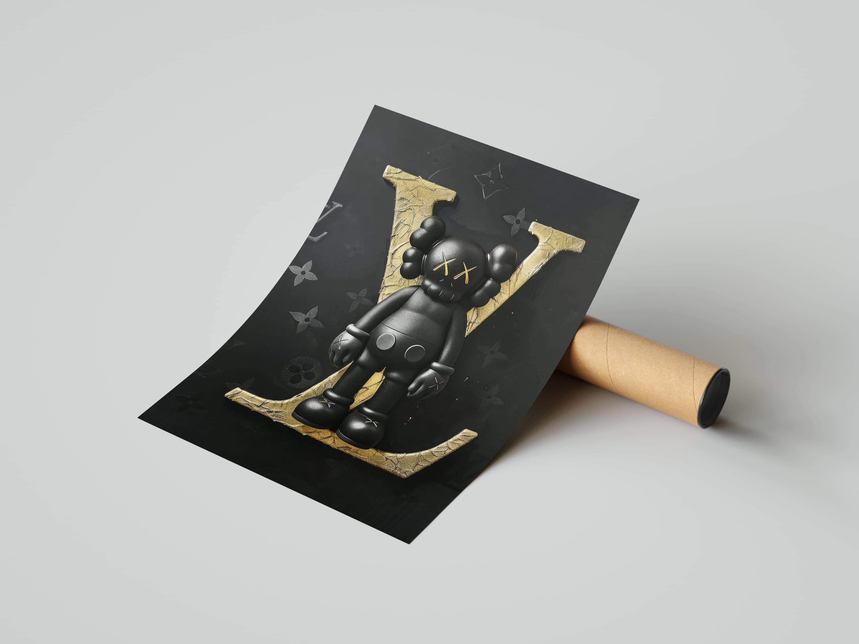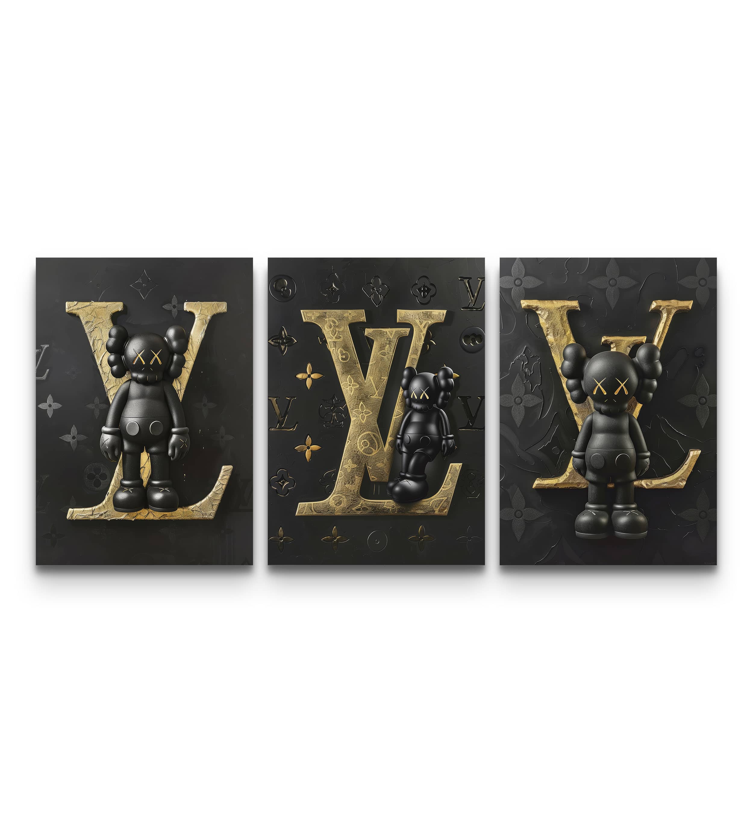 - 3-piece poster set: each with a distinct KAWS pose over a gold Louis Vuitton monogram