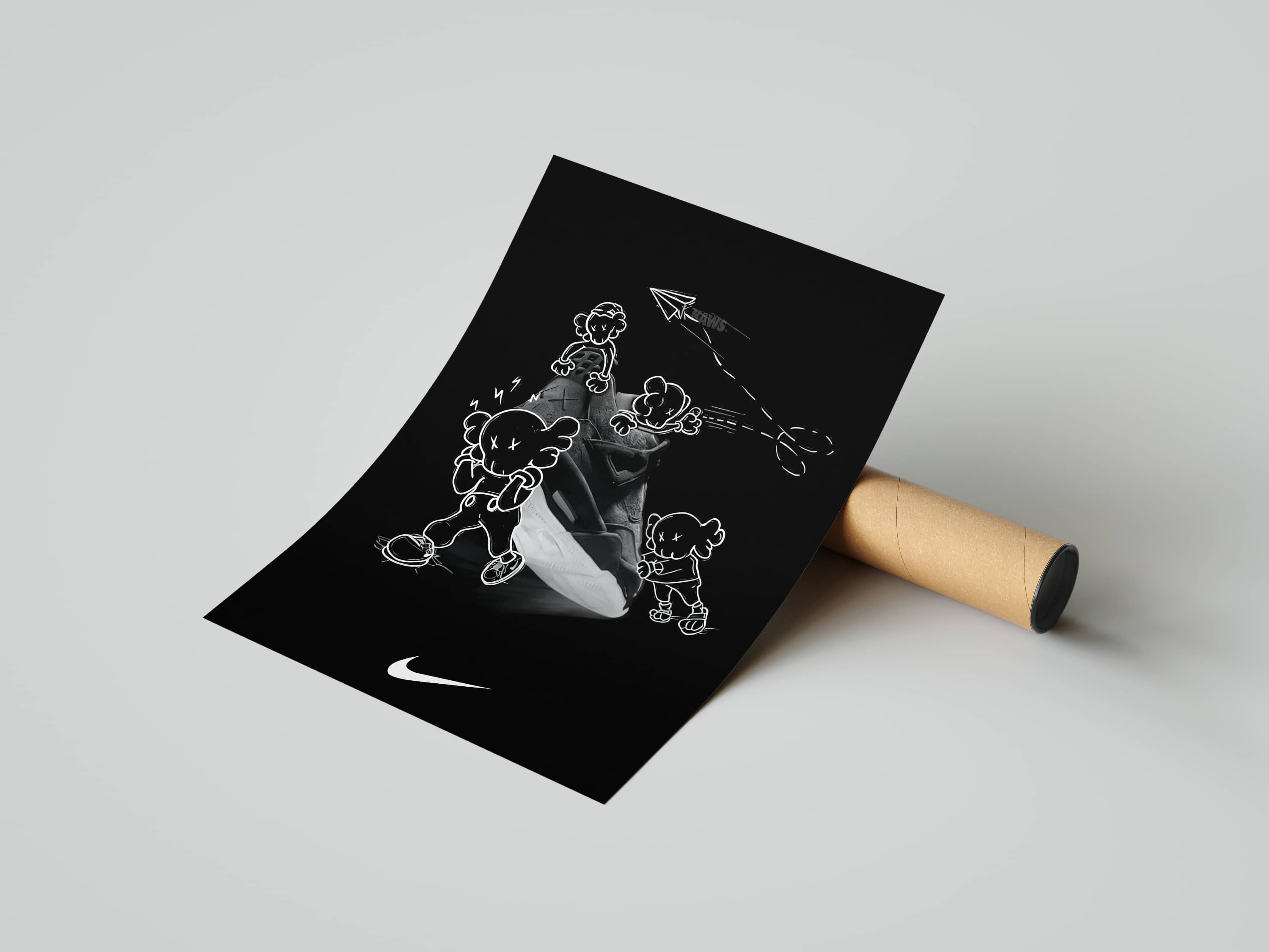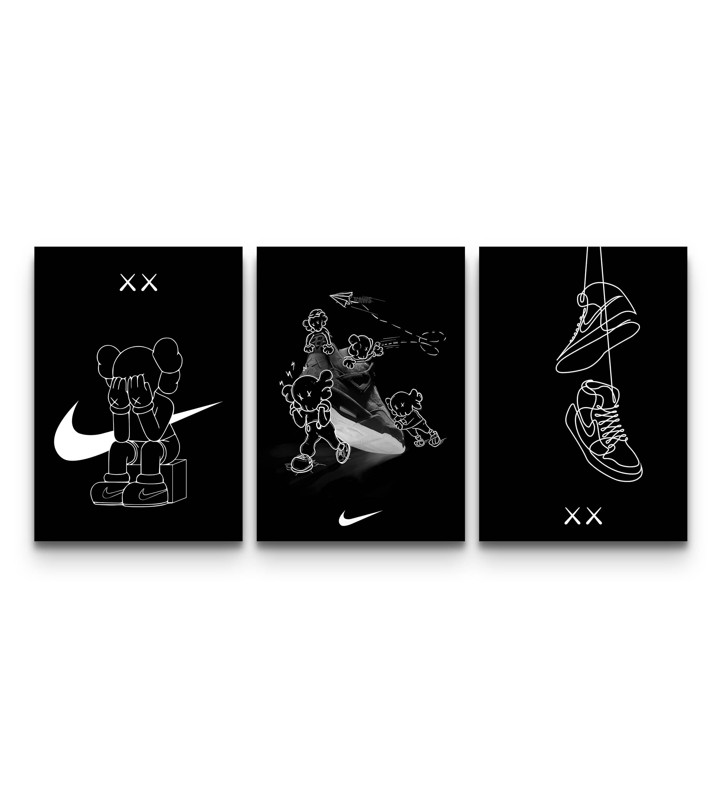 Minimalism meets sneaker culture in this bold blacked-out trio. Hypebeast Figure Vol. 36: KAWS X Nike Retro Sketch Series brings together the world of street art and classic kicks—iconic KAWS companions are paired with hand-drawn Swooshes, flying paper planes, and legendary sneakers in continuous-line art. The result: a high-contrast wall statement that feels modern, mysterious, and instantly collectible.
