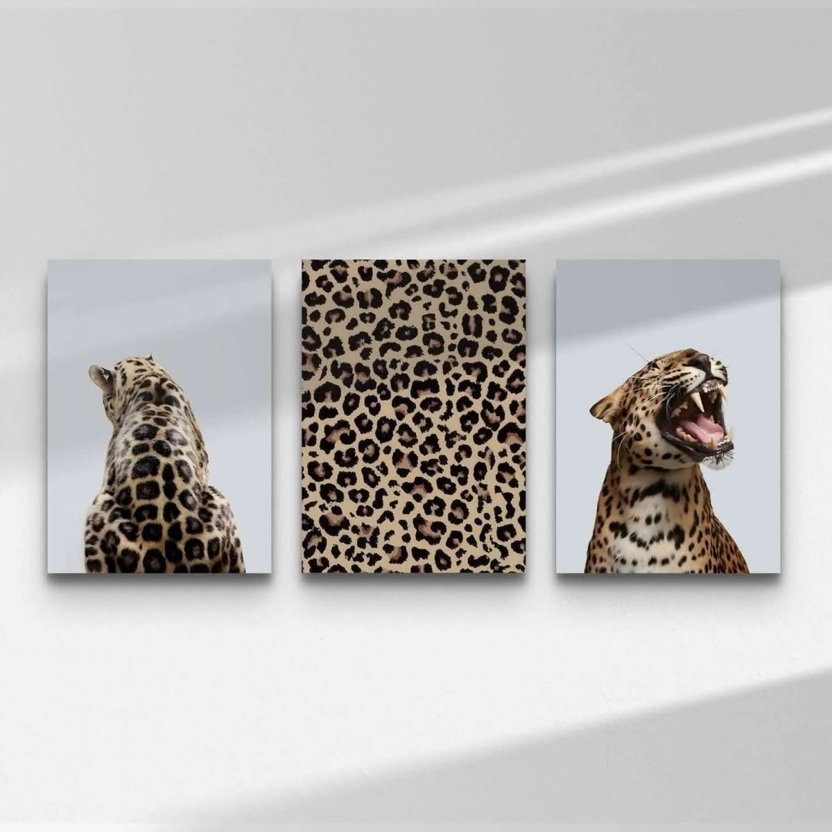 Leopard Design Wall Art Set of 3 featuring a stunning leopard pattern and a roaring leopard image, perfect for wall decor.