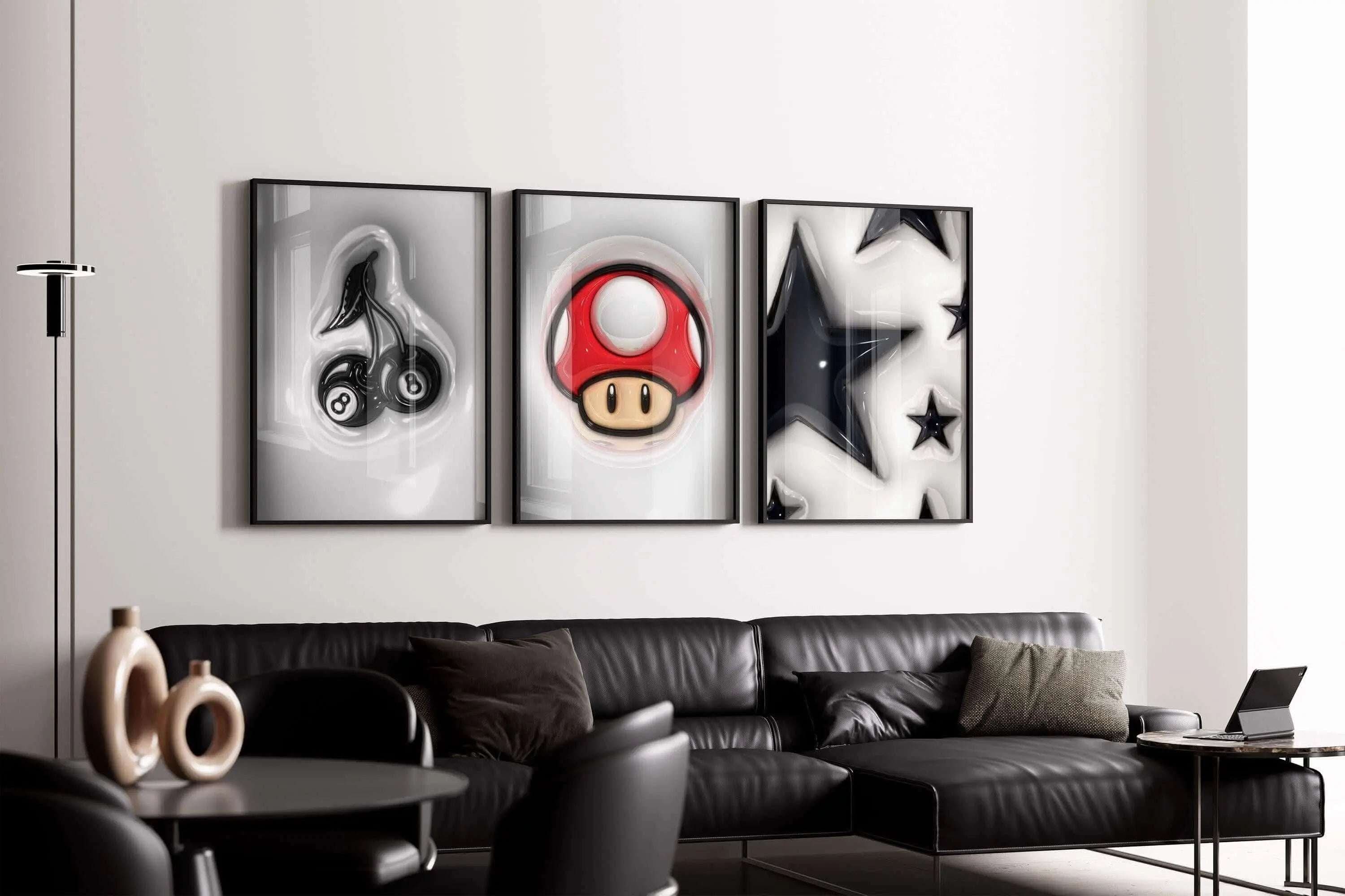 Display of sleek digital wall art with a red and black mushroom icon centerpiece, framed elegantly.